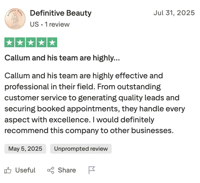 We can confidently say, that what we've developed, our way of attracting new clients is completely different and unique to anything else out there. Additionally, you don't have to put the hard work in figuring this out yourself, because we've proven this system dozens of times over and even better we reverse the risk into us. You'll get the perspective, systems and results of top-vetted marketing pros specialised in helping aesthetic clinics and med spas.